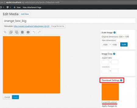 В WordPress, как и в любой уважающей себя CMS, можно загружать произвольные файлы и встраивать их в публикуемые посты. Самый очевидный способ применения — это добавление фотографий. Если файл загруженной картинки больше установленных в настройках размеров, то для него создаются миниатюры (thumbnails). Самую мелкую из них можно увидеть при нажатии на кнопку редактирования картинки (в закладке медиа в разделе Thumbnail Settings).