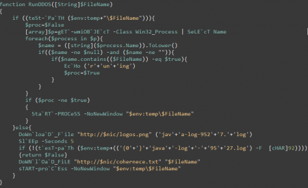 Эксперты отмечают, что это единственная функция PowerGhost, которая копирует файлы на жесткий диск. Вполне вероятно, что пока это тестовый инструмент и в дальнейшем он будет заменен на бесфайловую реализацию. В пользу того, что функция была добавлена в данный образец «на скорую руку», говорит и особенность запуска DDoS-модуля. Скрипт скачивает два PE-модуля logos.png и cohernece.txt. Первый сохраняется на диске как java-log-9527.log и представляет собой исполняемый файл для проведения DDoS-атак. Файл cohernece.txt защищен протектором Themida с опцией проверки запуска в виртуальной среде. Если проверка не обнаружила песочницу, то cohernece.txt запускает файл java-log-9527.log на исполнение. Таким странным способом к уже готовому DDoS-модулю добавили функцию проверки виртуальной среды.
