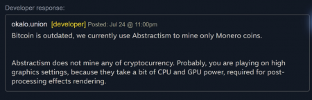 Продолжив расследование, SidAlpha выявил многочисленные жалобы пользователей и на другую проблему. Оказалось, что пользователи обвиняют Abstracticism в скрытом майнинге криптовалюты, так как весьма примитивная инди-игра по каким-то причинам потребляла подозрительно большое количество системных ресурсов. Более того, в одном из сообщений для пользователей разработчики рекомендовали оставлять игру включенной как можно дольше. Якобы это должно было увеличить шансы выпадения более редких предметов.