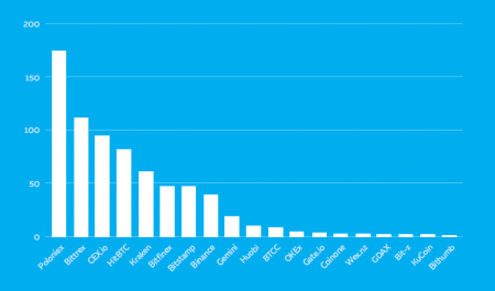 Исследование показало, что наибольшее число скомпрометированных учетных записей в данной выборке пришлось на биржи Poloniex – 174 учетных записи, Bittrex – 111, CEX.io – 95, HitBTC — 83, Kraken — 61. Эксперты полагают, что Такое распределение, вероятнее всего, связано с популярностью данных торговых площадок среди инвесторов и в интернете в целом, что привлекло внимание мошенников.