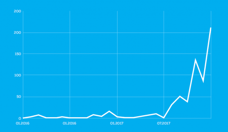 Антирекорд продемонстрировал и первый месяц 2018 года: из-за повышенного интереса к криптовалютам и блокчейн-индустрии количество инцидентов в январе выросло на 689% по сравнению со среднемесячным показателем 2017 года. Так, по данным Google Trends, интерес к криптовалютам достиг максимального значения именно в конце 2017 года.