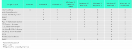Хуже того, по данным enSilo, подобные атаки в теории могут представлять опасность и для macOS и Linux, так как таблицы страниц используются и здесь. Впрочем, специалисты признаются, что не изучали это направление атак, пока сконцентрировавшись на Windows. Как видно на иллюстрации ниже, в случае операционной системы Microsoft, методика Turning Tables позволяет преодолеть практически все защитные механизмы ОС, представленные разработчиками в последние годы.