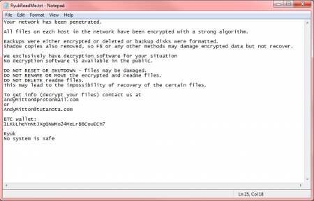 Также обнаружилось, Ryuk показывает свои жертвам разные версии сообщений с требованием выкупа. Существуют длинная и короткая версия послания, и обе предлагают жертвам связаться с авторами Ryuk по электронной почте.