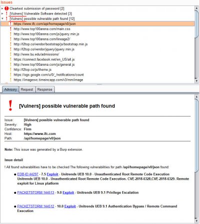Этот плагин показывает публичные уязвимости для приложений, обнаруженные в трафике, который проксирует Burp. Расширение было написано Иваном Ёлкиным, одним из сооснователей сервиса vulners.com. Представляет собой, по сути, прослойку между Burp и API этого отличного агрегатора уязвимостей.