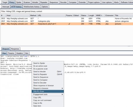 Затем во вкладке SQLMap Scanner в настройках плагина нужно указать адрес нашего API. Теперь все, что от тебя требуется, — это выбрать подопытный запрос, кликнуть правой кнопкой мыши внутри его тела и выбрать пункт SQLiPy Scan.