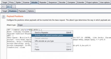 Кстати, на всякий случай расскажу, что если тебе необходимо натравить активный сканер только на определенные места в запросе, то запрос нужно добавить в Intruder, расставить § в нужных позициях, а затем нажать правой кнопкой мыши и выбрать Actively scan defined insertion points.