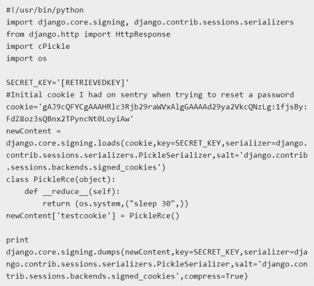 Изучив логи, исследователь выяснил, где в стеке обрабатываются детали cookie, а также обнаружил, что приложение использует Pickle и это может стать «слабым звеном». Так, специалист создал специальные cookies, которые провоцировали выполнение команд на уязвимой машине. Код proof-of-concept эксплоита можно увидеть ниже.
