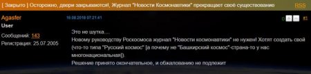 Новость была встречена негативно как на форуме «Новости космонавтики» (тема свалилась в политику и была закрыта) — Осторожно, двери закрываются!, Журнал «Новости Космонавтики» прекращает своё существование