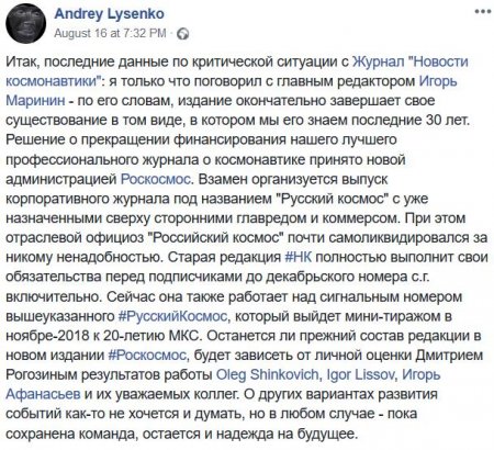 Российский журнал и форум «Новости космонавтики» — эпоха, явление, бренд популяризации российской космонавтики и её истории, исчезнет в ближайшее время. В отличии от предыдущего случая в 2015 году, в этот раз нефинансовые причины. Новому руководству Роскосмоса не нужен такой журнал.