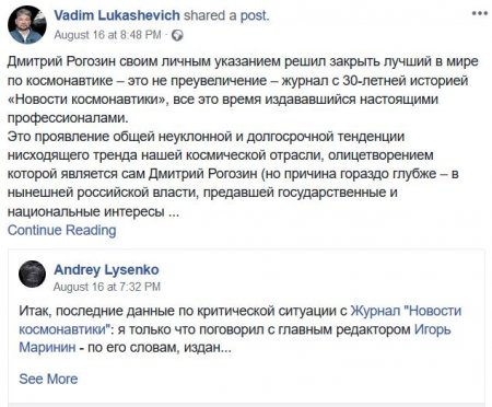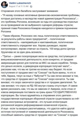 Следующим постом была подробная критика деятельности Рогозина и его планов: