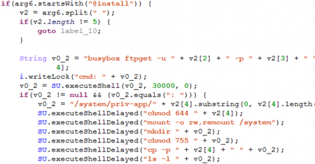Как видно на скриншоте, приведенном выше, новый компонент копировался в системную директорию, хотя операция такого типа невозможна без root-привилегий. Пока у специалистов нет свидетельств того, что для получения root-привилегий хакеры использовали какой-либо эксплоит, но, возможно, для этого злоумышленники прибегали к помощи какой-то неизвестного компонента.