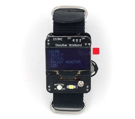 Deauther Wristband — браслет со встроенным дисплеем, батареей и переключателем. Удобное устройство для быстрого доступа к панели управления.