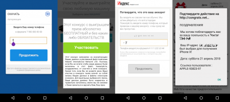 Заразив устройство, этот троян открывает один из фишинговых сайтов, на котором пользователю предлагают скачать ту или иную известную программу, либо сообщают о выигрыше ценного приза. У потенциальной жертвы мошенничества запрашивают номер мобильного телефона, якобы необходимый для получения проверочного кода. На самом деле этот код нужен для подтверждения подписки на платную услугу, за использование которой каждый день будет взиматься плата.
