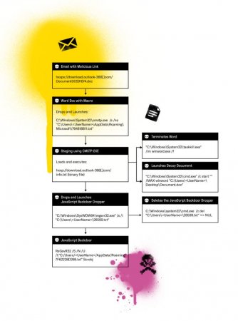 Фишинговые послания группировки содержали сразу два типа URL: одни ссылки вели к загрузке вредоносного файла Word, содержащего обфусцированные скрипты VBA, другие приводили к загрузке бинарника, замаскированного под файл JPG. Оба вектора атак использовались для заражения целевых систем бэкдорами.