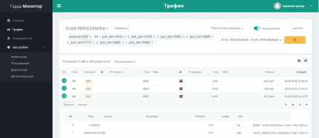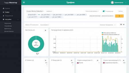 Инженеры «Гарды Технологии» совместно с отделом ИБ заказчика с помощью комплекса «Гарда Монитор» детально исследовали трафик организации. Начали с поиска обращений к адресам майнинговых пулов — серверов, которые объединяют мощности оборудования сразу многих майнеров для повышения вероятности нахождения блока и делят награду за его добычу между всеми участниками. Такой трафик обнаружен не был.