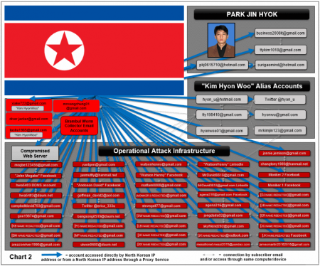«Связи между аккаунтами Chosun Expo Пака и аккаунтами Kim Hyon Woo включали общий доступ к зашифрованному архиву .rar, сохраненным учетным записям Kim Hyon Woo в адресной книге Chosun Expo, использование уведомлений о прочтении между этими наборами аккаунтов, использование общих имен и псевдонимов, а также, в числе прочего, доступ к этим аккаунтам осуществлялся с одних и те же IP-адресов», — гласит документ.