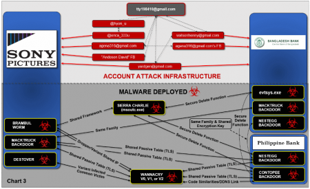 Также в Минюсте считают, что подозреваемый принимал участие в создании различных вредоносных инструментов Lazarus Group. Однако трудно сказать, над какой именно малварью тот мог работать, ведь за годы существования инструментарий хак-группы постоянно менялся, дополнялся и эволюционировал. На иллюстрации ниже можно увидеть связи между некоторыми атаками и инструментами группировки.