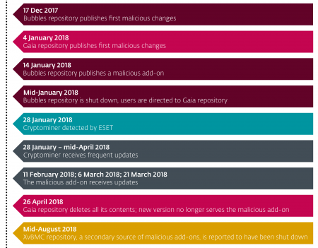 Вредоносная операция, судя по всему, началась еще в декабре 2017 года, и первым был скомпрометирован аддон script.module.simplejson (верия 2.16.0 и выше) из уже неработающего репозитория Bubbles. Однако когда Bubbles закрылся, распространять малварь начали через репозитории Gaia и XvBMC (недавно тоже были закрыт из-за нарушений авторских прав). Однако одни и те же аддоны для Kodi, как правило, доступны в разных репозиториях, и, скорее всего, вредоносные файлы по-прежнему существуют в других источниках.