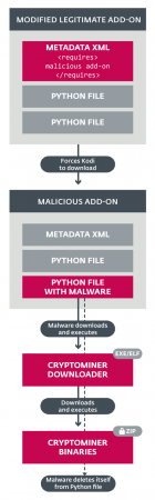 Аналитики ESET пишут, что обнаруженная ими малварь провоцировала загрузку дополнительного плагина для Kodi, который определял, с какой ОС имеет дело, а затем скачивал и устанавливал подходящий майнер для криптовалюты Monero. Хотя Kodi доступен для множества платформ, операторы данной кампании ограничивались компрометацией пользователей Windows и Linux.