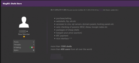 По данным исследователей, MagBO появился сравнительно недавно (в первой половине 2018 года) и должен составить конкуренцию таким площадкам, как HackForum, Exploit.in, xDedic, Nulled и Mal4All. Однако от конкурентов MagBO отличает один немаловажный нюанс, — на новом форуме продают web shell’ы для уже скомпрометированных сайтов. То есть на продажу выставлен доступ к ресурсам, на которых уже размещены какие-то бэкдоры, которые позволяют покупателям без труда проникнуть в систему.