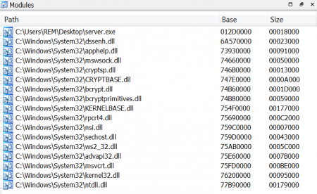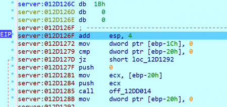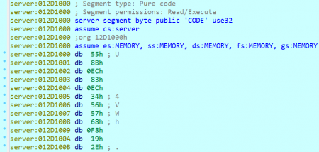 На втором скриншоте видно, что дамп был сделан в момент выполнения инструкции внутри процесса server.exe. Чтобы проанализировать память процесса server.exe, необходимо найти базовый адрес текущей функции и определить ее в IDA Pro.