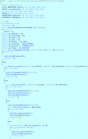 Первым делом процесс server.exe инициализирует сетевое взаимодействие с клиентом. Псевдокод функции инициализации после переименования стандартных имен и создания необходимых структур данных изображен ниже.