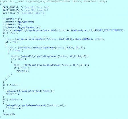 В данном случае протокол Диффи — Хеллмана реализован согласно документации Microsoft. В качестве открытых параметров Диффи — Хеллмана на стороне клиента и на стороне сервера используются стандартные значения модуля и генератора, указанные в источнике. Секретный параметр Диффи — Хеллмана генерируется случайным образом при вызове функции CryptSetKeyParam с аргументом KP_X.