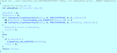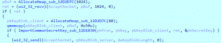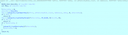 Из рисунка видно, что общий сессионный ключ импортируется для шифрования данных с помощью алгоритма RC4. Аналогично ключ должен импортироваться на стороне клиента после получения тем блоба публичного ключа Диффи — Хеллмана, сгенерированного сервером.