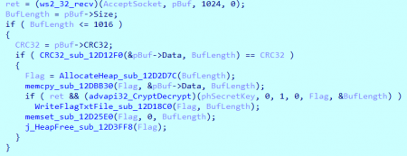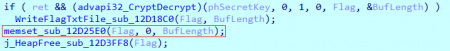 Стало понятно, какие именно данные пишутся в файл flag.txt. Проблема в том, что в дампе процесса server.exe эти данные могли остаться только в зашифрованном виде, так как перед снятием дампа буфер с расшифрованными данными умышленно был перезаписан нулями.