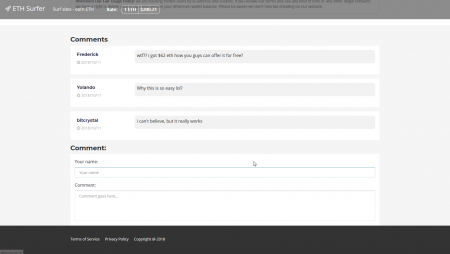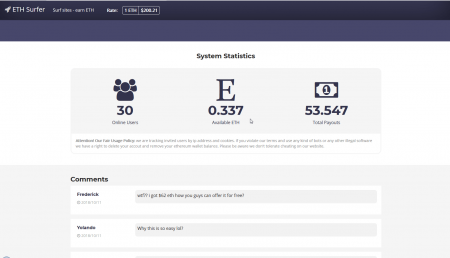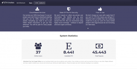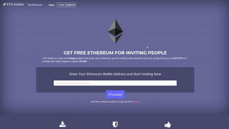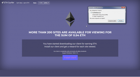 Еще один созданный Investimer’ом мошеннический ресурс посвящен криптовалюте Etherium. Потенциальным жертвам предлагается вознаграждение за просмотр сайтов в сети, для чего им также предлагается установить вредоносную программу под видом специального приложения. Здесь троян начинает загружаться автоматически, при входе посетителя на сайт. Преступник даже озаботился написанием нескольких поддельных отзывов о работе данного сервиса.