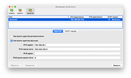 После того как скачали образ и установили VirtualBox, время настраивать сеть. Открываем менеджер сетей хоста и создаем новый адаптер.