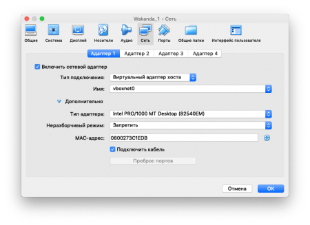Импортируем виртуалку в VirtualBox и идем в ее настройки. Нам нужна вкладка «Сеть». Устанавливаем тип подключения как «Виртуальный адаптер хоста» и указываем недавно созданный виртуальный адаптер. Обращаем внимание на созданный MAC-адрес, так как он нам еще понадобится, чтобы найти его в сети.