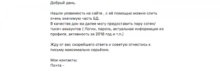 Участники хак-группы взламывали личные кабинеты клиентов банков, интернет-магазинов, страховых компаний. Получив доступ к учетной записи, они под видом специалистов по информационной безопасности требовали от организаций вознаграждения за якобы обнаруженные «уязвимости» в их системах. В качестве доказательства они предоставляли скомпрометированные ими учетные записи организаций-жертв. Размер «вознаграждения» составлял от 40 000 до 250 000 рублей. Пример такого письма можно увидеть ниже.
