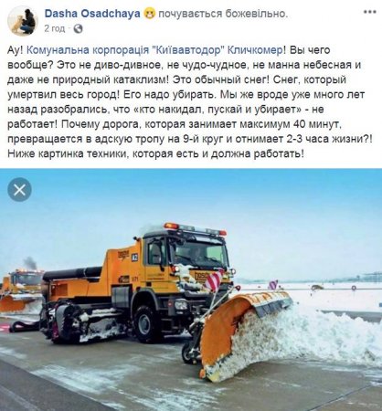 Кроме того, внимание пользователей привлек очередной снежный апокалипсис в Киеве. Хотя и мэр Киева Виталий Кличко отмечал, что коммунальные службы столицы работают в круглосуточном режиме, однако киевляне этого не заметили. Поэтому интернет традиционно заполонили шутки и жалобы на эту тему.