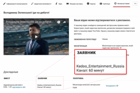 Впоследствии появилась информация, что права на этот ролик принадлежит российской компании Kedoo Entertainment Russia. Дело в том, что тем ресурсам, которые загрузили видео с Зеленским относительно дебатов на свои YouTube-каналы, пришло соответствующее сообщение от видеосервиса.