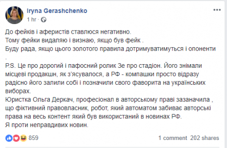 "Этот ролик снимали не местные продакшн-компании, как выяснилось, а российские – компашки просто сразу радостно его залили себе и обозначили своего фаворита на украинских выборах. Юрист Ольга Деркач, профессионал в авторском праве отметила, что фиктивный правообладатель, робот, который автоматом забивает авторские права на весь контент, был использовано в новостях РФ", – убеждает вице-спикер украинского парламента Ирина Геращенко.