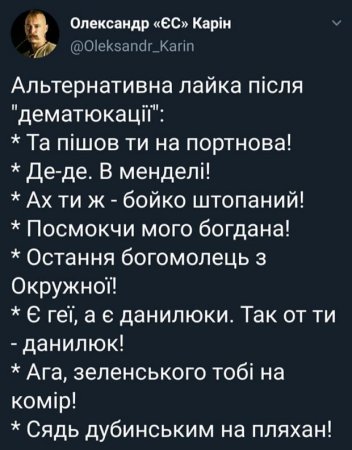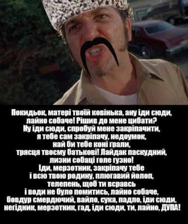 - МАТЮКНИСЬ, МАТЮКНИСЬ ЩЕ РАЗ, НАСЕРУ Я ТВОЇЙ МАТЕРІ І Я КЛЯНУСЬ БУЛАВОЙ ХМЕЛЬНИЦЬКОГО ТВІЙ НІЦ МОЗОК ВИЛЕТИТЬ ЯК БДЖОЛА ЮЩЕНКА!