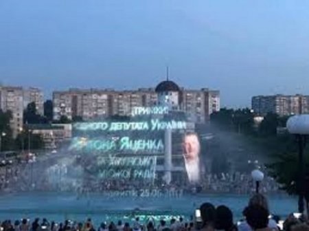 А в Умани, что на Черкасщине, установили светомузыкальные фонтаны, на которых с помощью световых элементов указано, что их открыли при поддержке кандидата Антона Яценко. Он баллотируется по округу №200 от партии "Возрождение". Фонтан еще и умеет проектировать лицо Яценко.