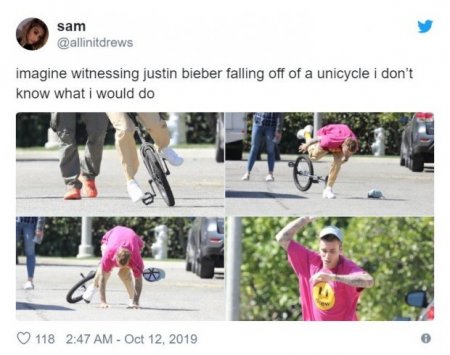 Американская звезда, певец Джастин Бибер навернулся с моноцикла. Момент падения зафиксировали на фото и оно стало мемом. Как с Бибера шутили соцсети – дальше.