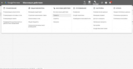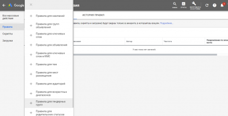 Другой вариант — откройте раздел «Кампании», «Группы объявлений» или «Ключевые слова» и нажмите на значок с тремя точками в правой части экрана, над таблицей статистики. Выберите «Создать автоматизированное правило».