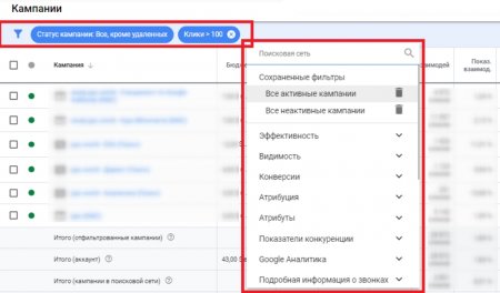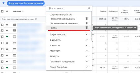 Как и столбцы, фильтры можно подобрать, назвать и сохранить по умолчанию. С их помощью можно выбирать нужные для работы кампании, группы объявлений, таргетинги.