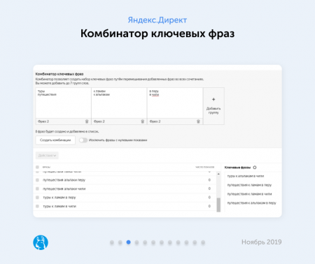 заработали обновленный подборщик и комбинатор ключевых фраз. Первый помогает подобрать ключевые и минус-фразы для кампаний. А комбинатор составляет сочетания заданных ключевых слов.