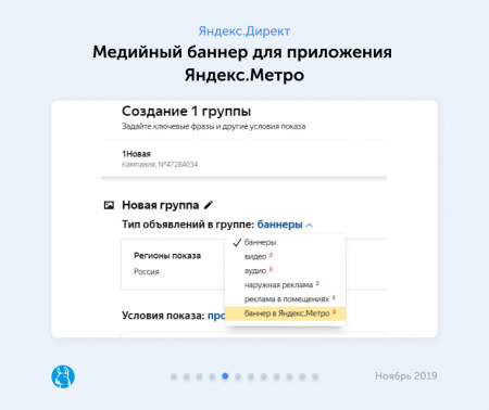 заработал новый тип группы объявлений — баннер в приложении Яндекс.Метро для устройств на iOS и Android. Пользователь увидит баннер, когда будет строить маршрут до станций, к которым привязана организация. При нажатии на объявление откроется турбо-страница с подробностями предложения. На этой странице также можно разместить ссылку для перехода на сайт или кнопку «Позвонить».