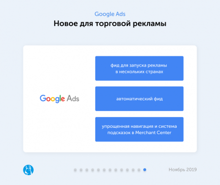 представила несколько обновлений для торговой рекламы: переработанный интерфейс Merchant Center, который позволяет выстроить более четкие процессы благодаря упрощенной навигации и системным подсказкам, и два фида — один для объявлений в странах, где жители используют один язык, и другой, который создается автоматически на основе данных с сайта продавца. Кроме того, Google Shopping заработал на более чем 50 новых рынках.
