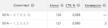 В нашем случае мы тестировали креативы и получили примерно одинаковое количество кликов. При этом CTR незначительно отличается — на 0,012%.