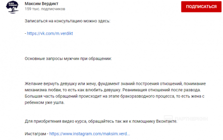 На чем только не зарабатывают в сети — главное найти тематику, которая волнует пользователей. Сегодня мы расскажем об одном из нестандартных способов заработка на консультациях по возврату бывших девушек и жен. Вердикт бывшим Есть на просторах сети персонаж, который называет себя Максим Вердикт. Он зарабатывает немалые по российским меркам деньги благодаря эксплуатации чувств брошенных парней. Его YouTube-канал заполнен роликами о том, как вернуть девушку или справиться с последствиями разрыва отношений. Если просмотреть его ролики, то можно прийти к выводу, что он еще больше раздувает комплексы и страхи своей аудитории, чтобы они толпой шли к нему на консультацию. Возьмем, к примеру, видео о том, как проверить свою девушку на верность. Максим напрямую призывает к провокации — советует парням анонимно прислать девушке цветы, чтобы проверить, расскажет ли она благоверному об этом. Естественно, такие авантюры часто добром не кончаются — и вот у Максима появляются новые клиенты. Но основная цель существования канал Вердикта — лить трафик на его «личный оффер» по возврату бывших. Хотя темы его видеороликов незамысловатые в духе «Как мужчины ведутся на женские провокации» или «Легкий способ забыть бывшую девушку», об их популярности говорит тот факт, что у Максима редкий ролик набирает меньше 50 000 просмотров, а зачастую они набирают более 100 000 просмотров. Учитывая нехилый трафик, дела у Максима идут хорошо. Насколько? Давайте посмотрим на цифры. За менее, чем два года с момента создания (19 февраля 2018 года), на канал было залито около 190 роликов, суммарное количество просмотров составило более 23 миллиона и за это время на него подписались 161 000 пользователей. При этом трафик у него сильно вырос с ноября 2019 года. Если до осени 2019 года его канал получал миллион просмотров, то уже декабрь-январь просмотры увеличились до 4 миллионов в месяц. Как выглядит воронка продаж Максима? Основным генератором трафика является YouTube-канал, где в среднем по статистике один его ролик просматривают более 124 000 раз. Также у него есть канал на Яндекс.Дзене и страница в Instagram. Трафик отовсюду льется на страницу в ВК, где и представлен его личный оффер — консультация за 15 000 рублей. Так в чем секрет его успеха? Он, как и все талантливые маркетологи, играет на болях своей аудитории. Парни, обиженные своими бывшими девушками и женами ищут рациональное объяснение произошедшего, и тут Максим им разжевывает, что во всем виновата женская суть, с которой можно и нужно бороться. Тема возврата бывших девушек и жен актуальна во всем мире, но больше всего она волнует мужчин в СНГ. Почему? В постсоветских странах сложилась иллюзия патриархального уклада семьи (пары), в которой главенство принадлежит мужчине. В ней девушка (жена) рассматривается как некая собственность, которую никто не имеет права от парня (мужа) отторгнуть. Такое положение дел выгодно государству, пропагандирующему традиционные ценности в противовес либеральным порядкам на Западе, которые бросают вызов сложившимся порядкам в обществе. По этой причине, зачастую, когда от парня уходит девушка, ему кажется, что он теряет то, что принадлежит ему по праву и он старается всеми силами вернуть ее. Также эту причину дополняет другая: в странах СНГ так сложилось, что в основном мужчина платит за девушку, покупает ей под