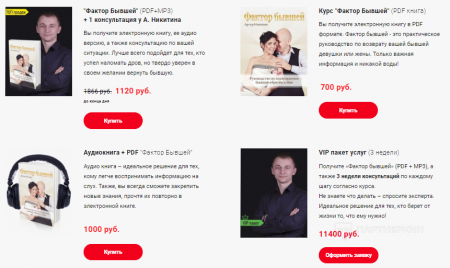 Он ведет YouTube-канал, блог, пишет статьи — и все это для того, чтобы сливать трафик на свой курс «Фактор бывшей», который стоит 700 рублей. А вот консультации на протяжении 3 недель уже стоят 11 400 рублей.