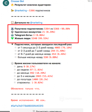 Многие админы просят скрин проверки @crosser_bot, он в числе прочего показывает аналитику по аудитории: