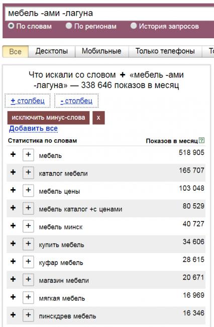 Рассмотрим подобный случай на примере покупки мебели. В Беларуси 180 тысяч показов приходится на производителя «Ами мебель», 338 тысяч — о покупке мебели без указания бренда «Ами мебель».
