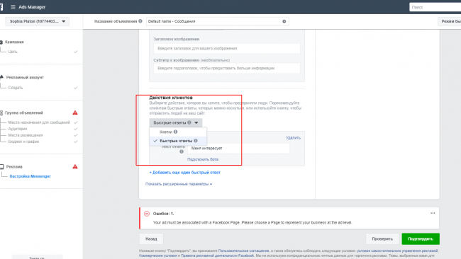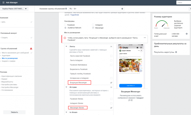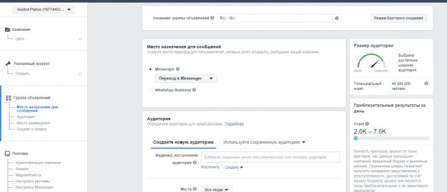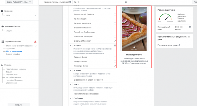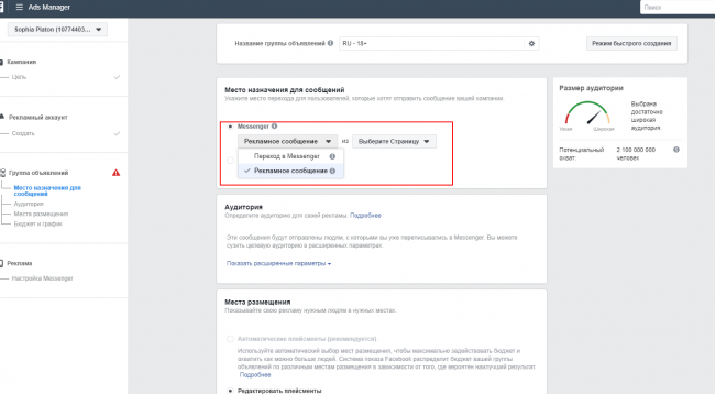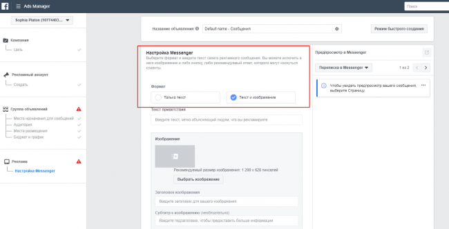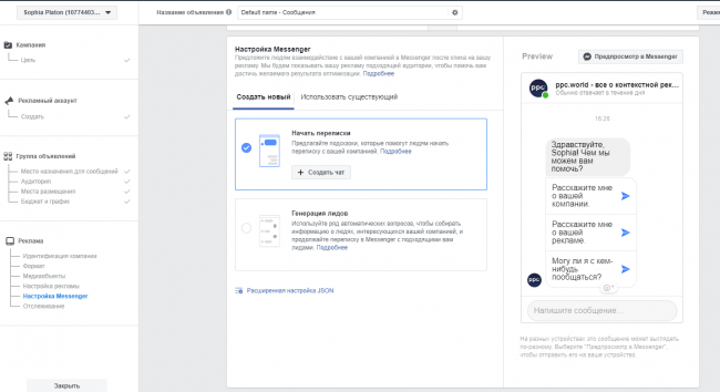 Теперь рассмотрим создание кампании для каждого типа объявлений в Messenger.